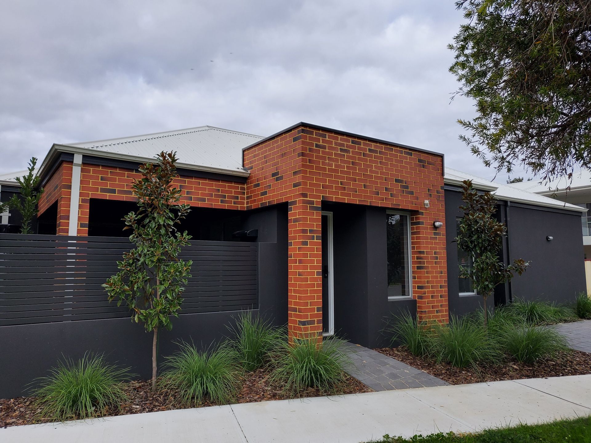 Repeated Bay Laurels accentuate the curved verge, bringing rhythm and structure. Evergreen planting complements red brick, bringing height, shade, and cooling to a once-exposed western frontage.