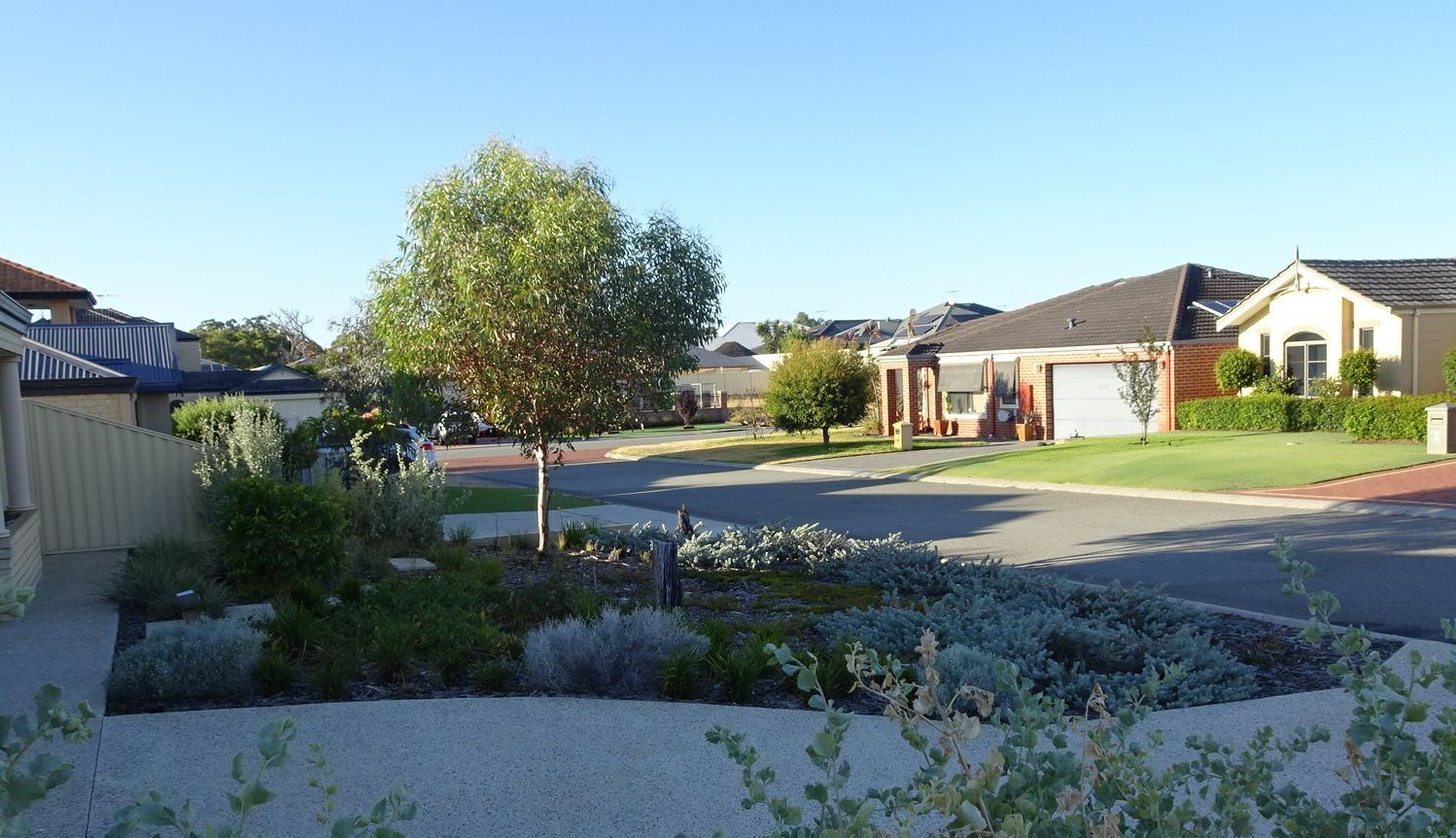A flat, water-hungry lawn now a flowing, waterwise landscape uniting verge and front garden. Public footpath now winds through, rather than skimming the landscape edge.