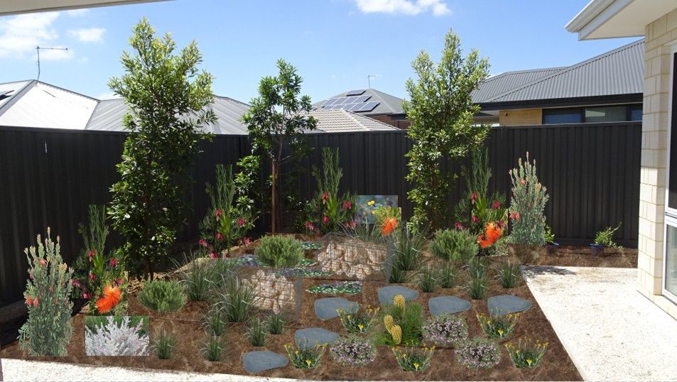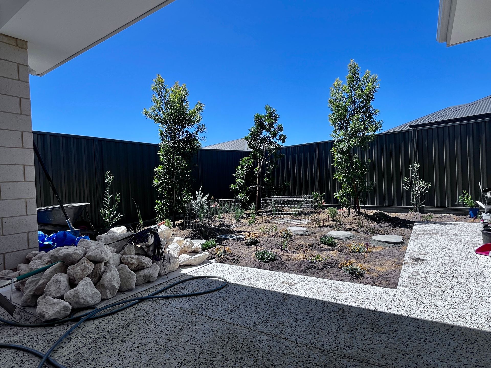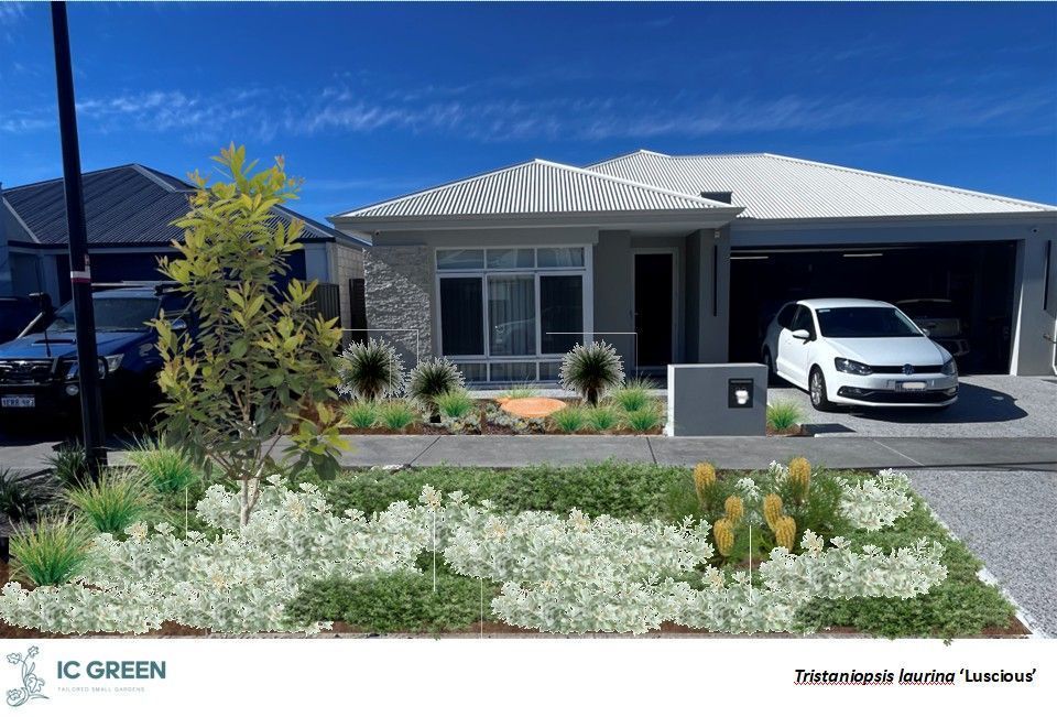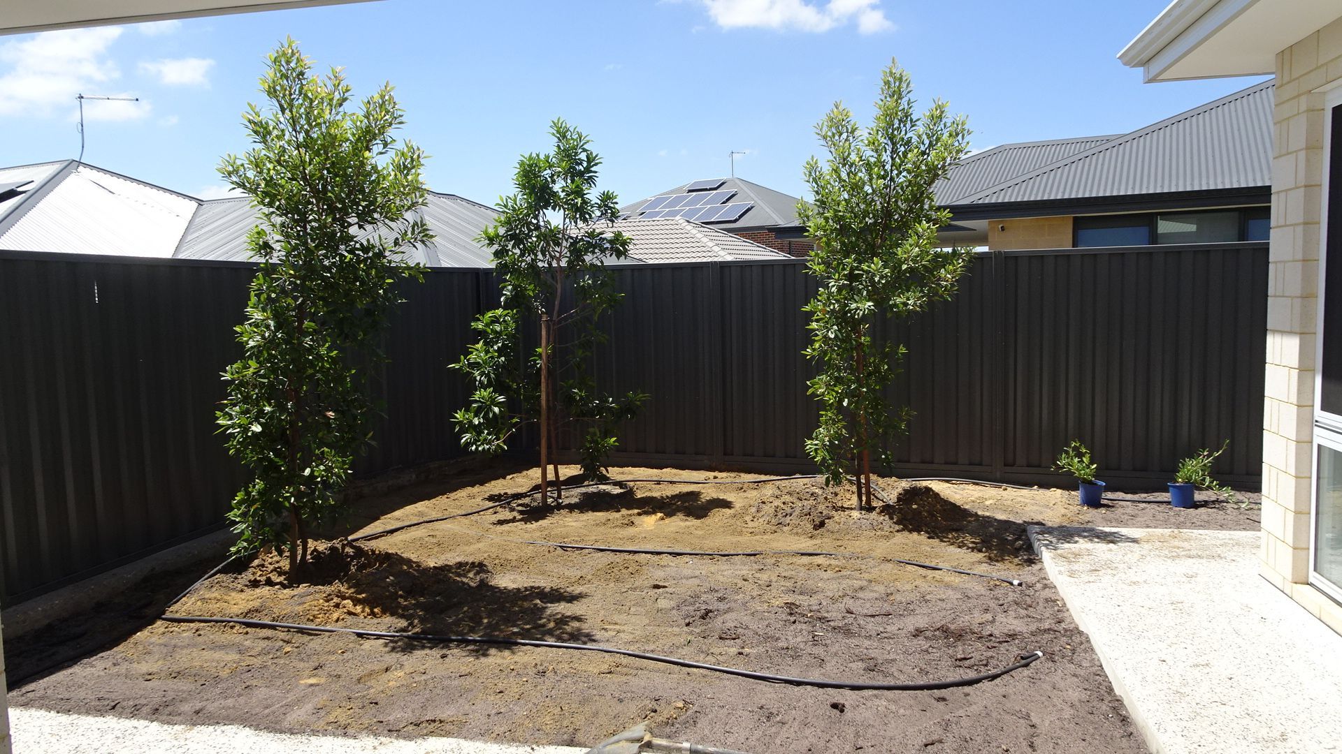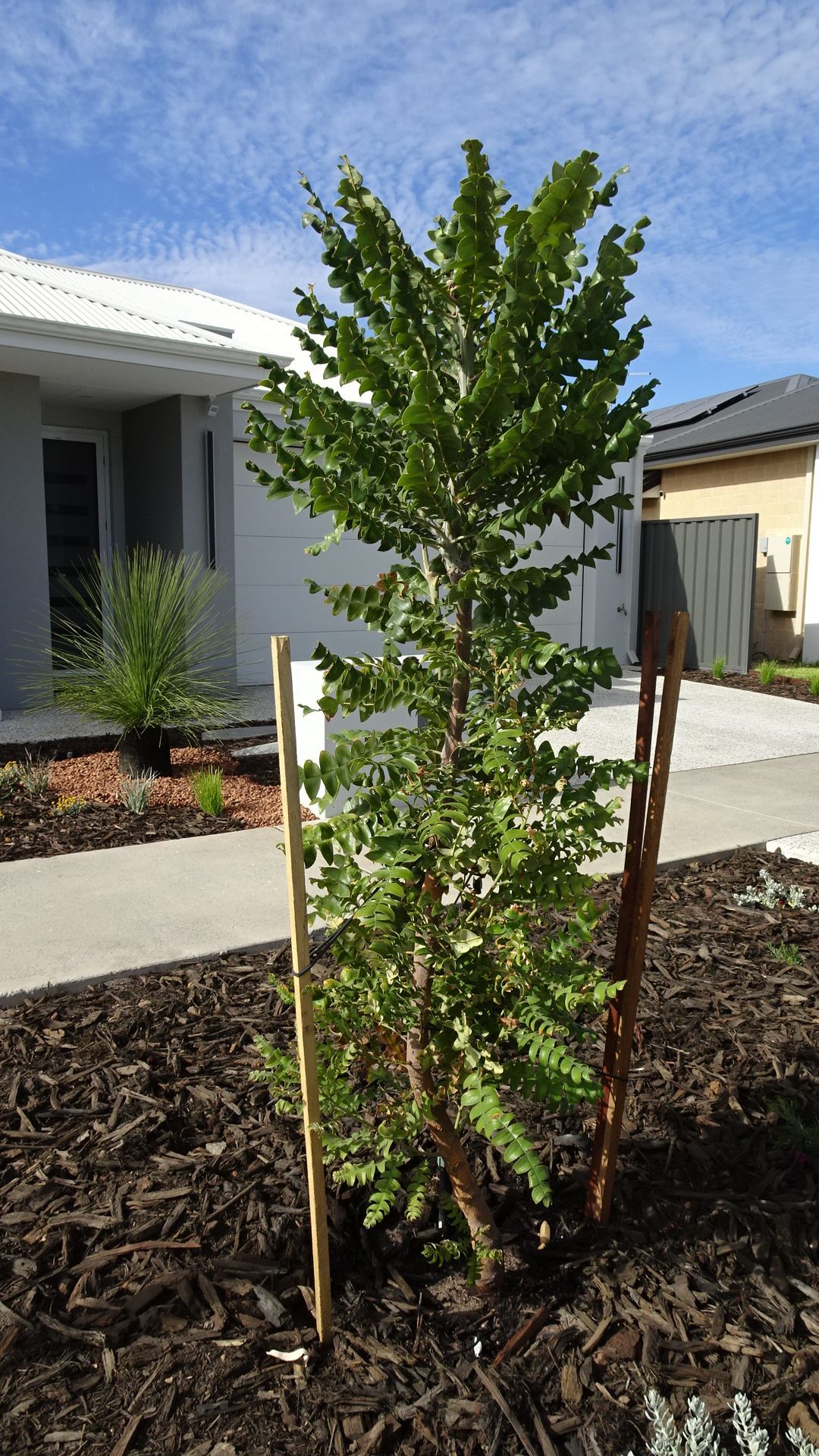 The mature trees for the rear yard are Queensland rainforest natives, supplied in 100L by Tony & Sons Nursery. The central tree is a Xanthostemon chrysanthus 'Golden Penda,' known for its wide canopy, feature flowers, and lush evergreen spreading foliage. It is flanked by Elaeocarpus reticulatus 'Prima Donna,' which will serve as both features and screening, with an oblong habit.