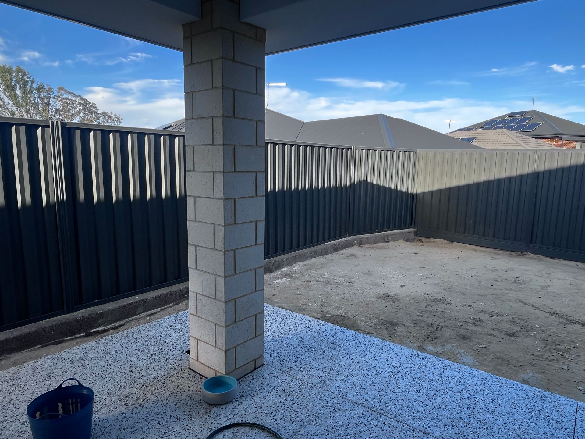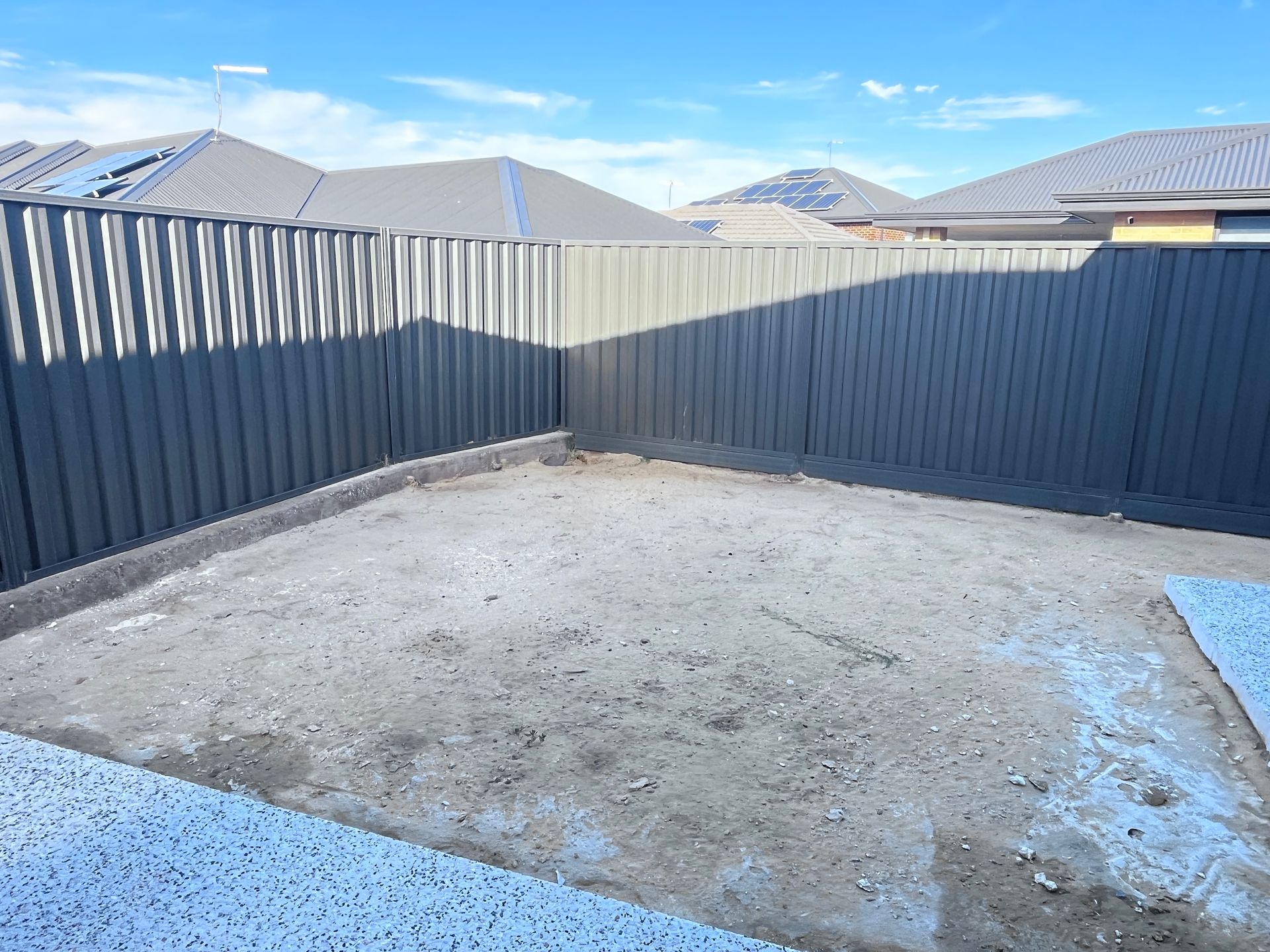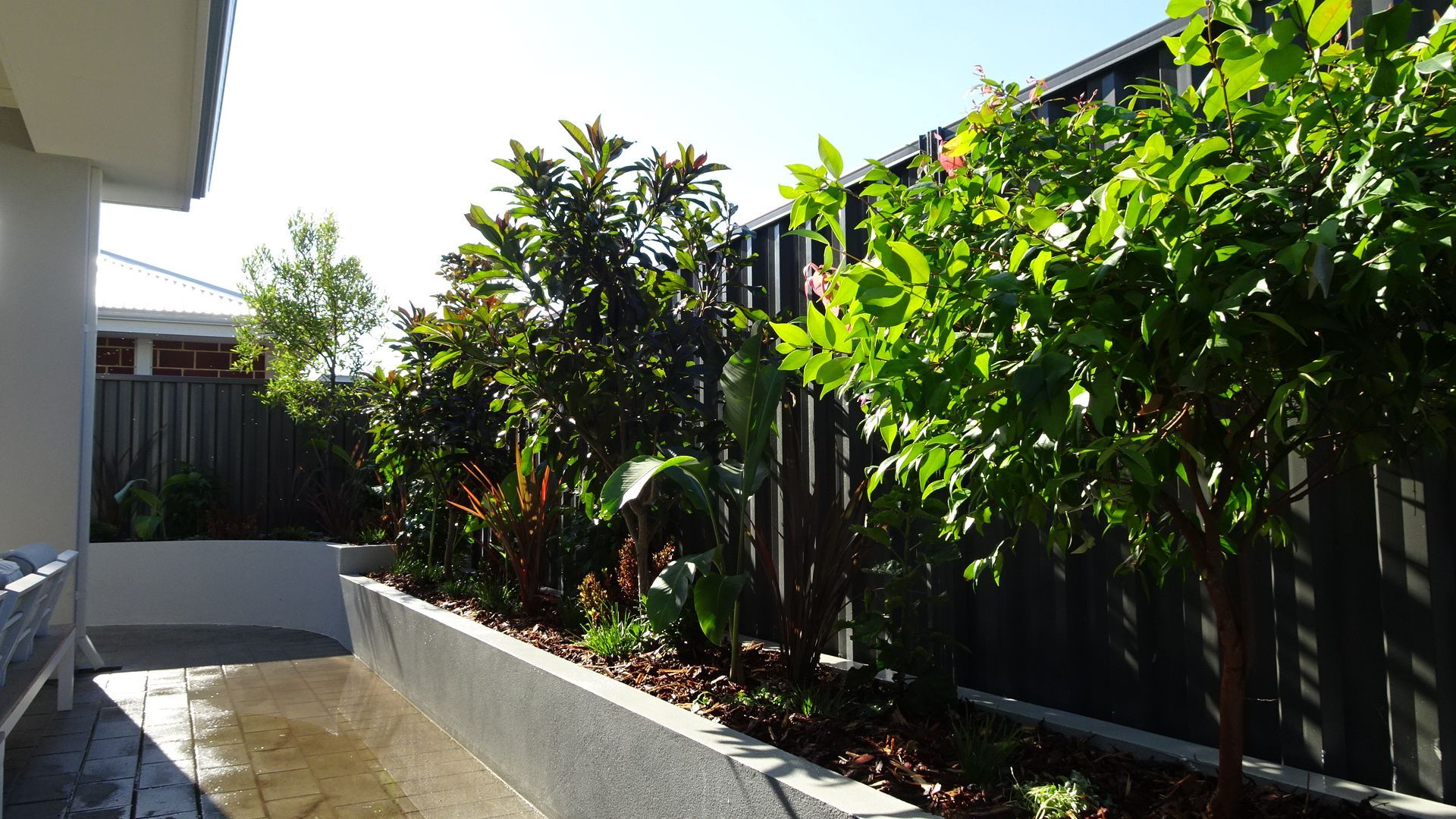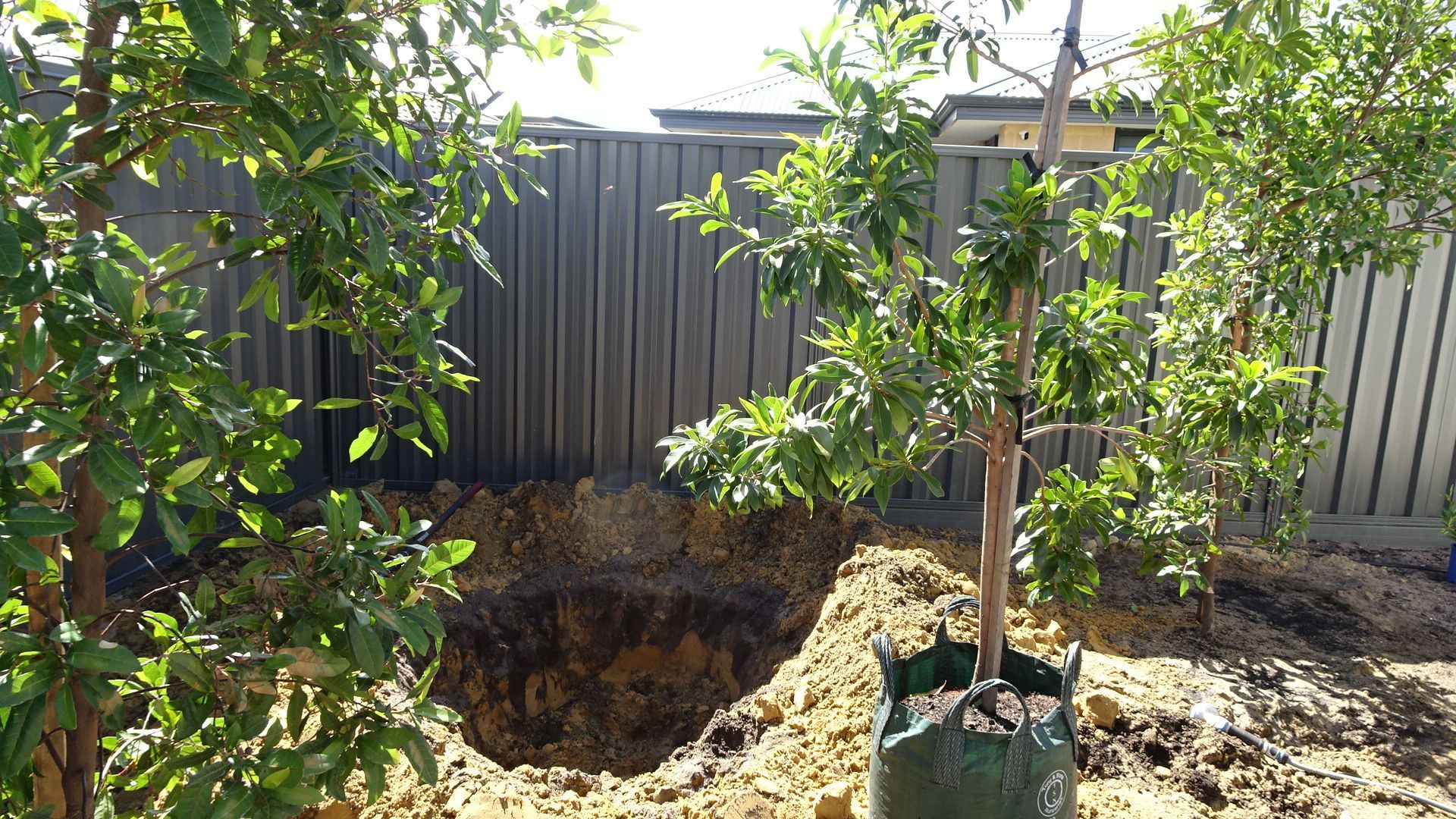 The mature trees for the rear yard are Queensland rainforest natives, supplied in 100L by Tony & Sons Nursery. The central tree is a Xanthostemon chrysanthus 'Golden Penda,' known for its wide canopy, feature flowers, and lush evergreen spreading foliage. It is flanked by Elaeocarpus reticulatus 'Prima Donna,' which will serve as both features and screening, with an oblong habit.