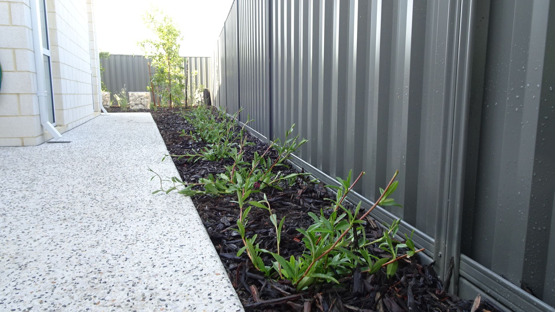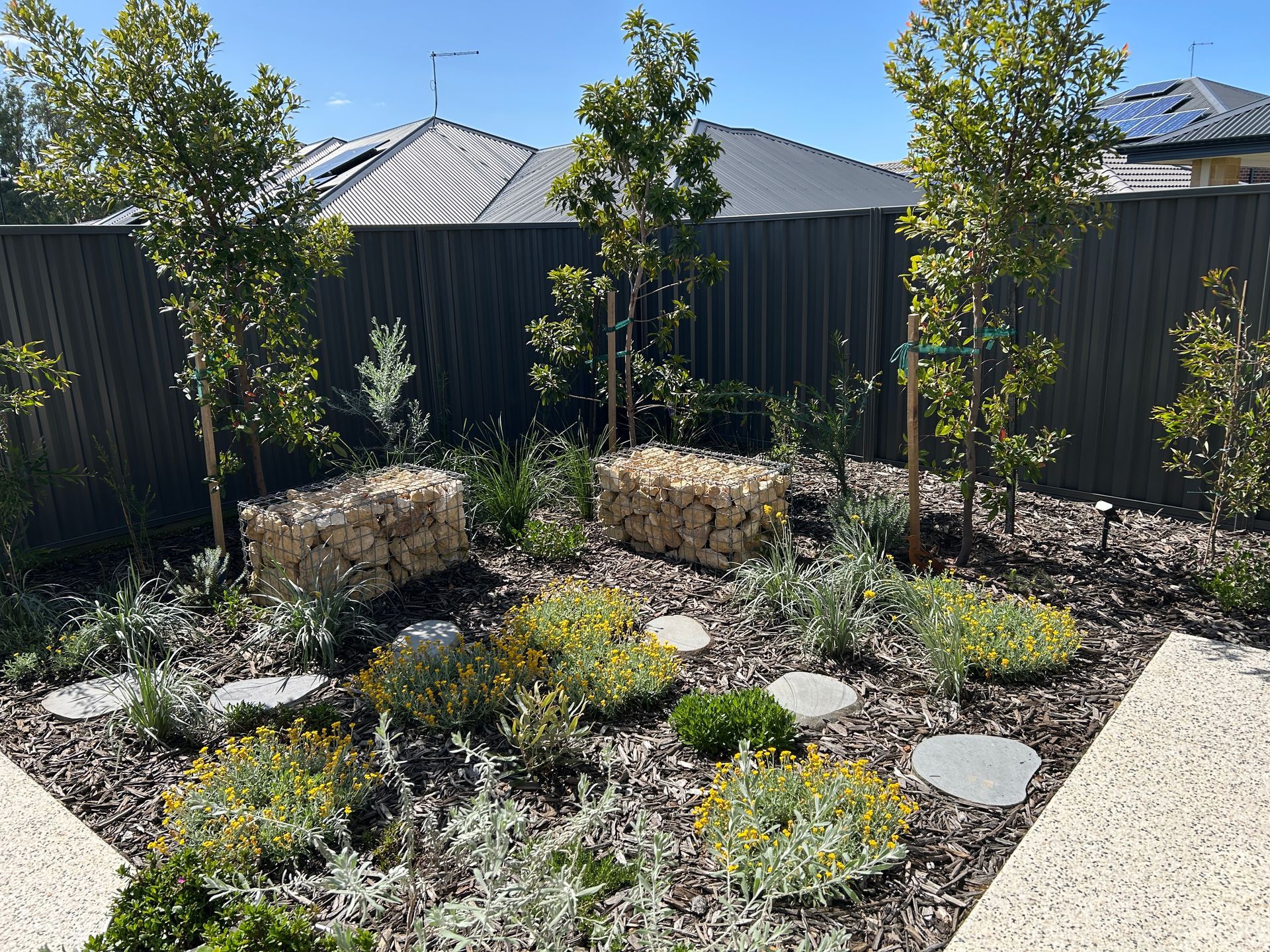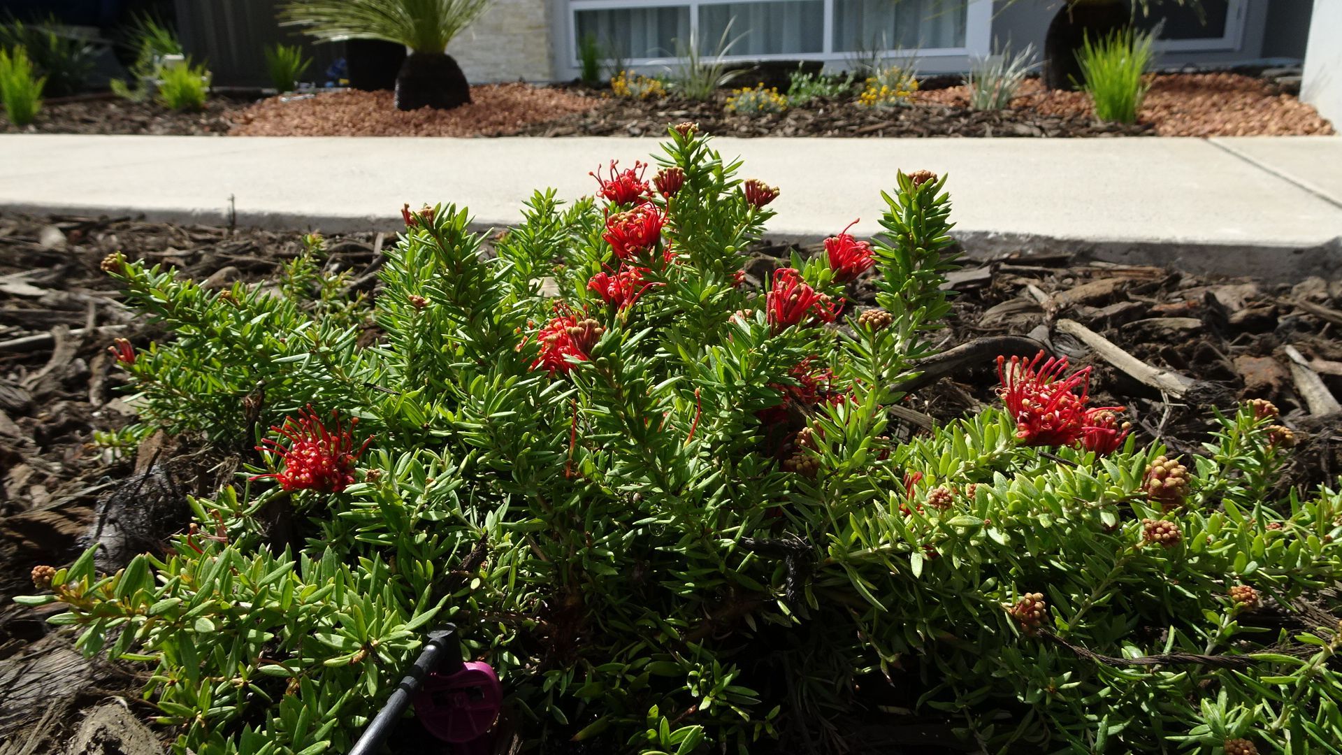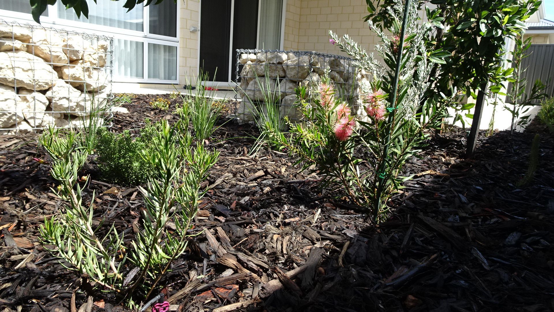 Installed in March, the garden’s three native grass trees have settled beautifully. After a very wet winter, their older outer foliage has begun to droop under the weight of moisture—a natural response as the plant adjusts to its new environment.