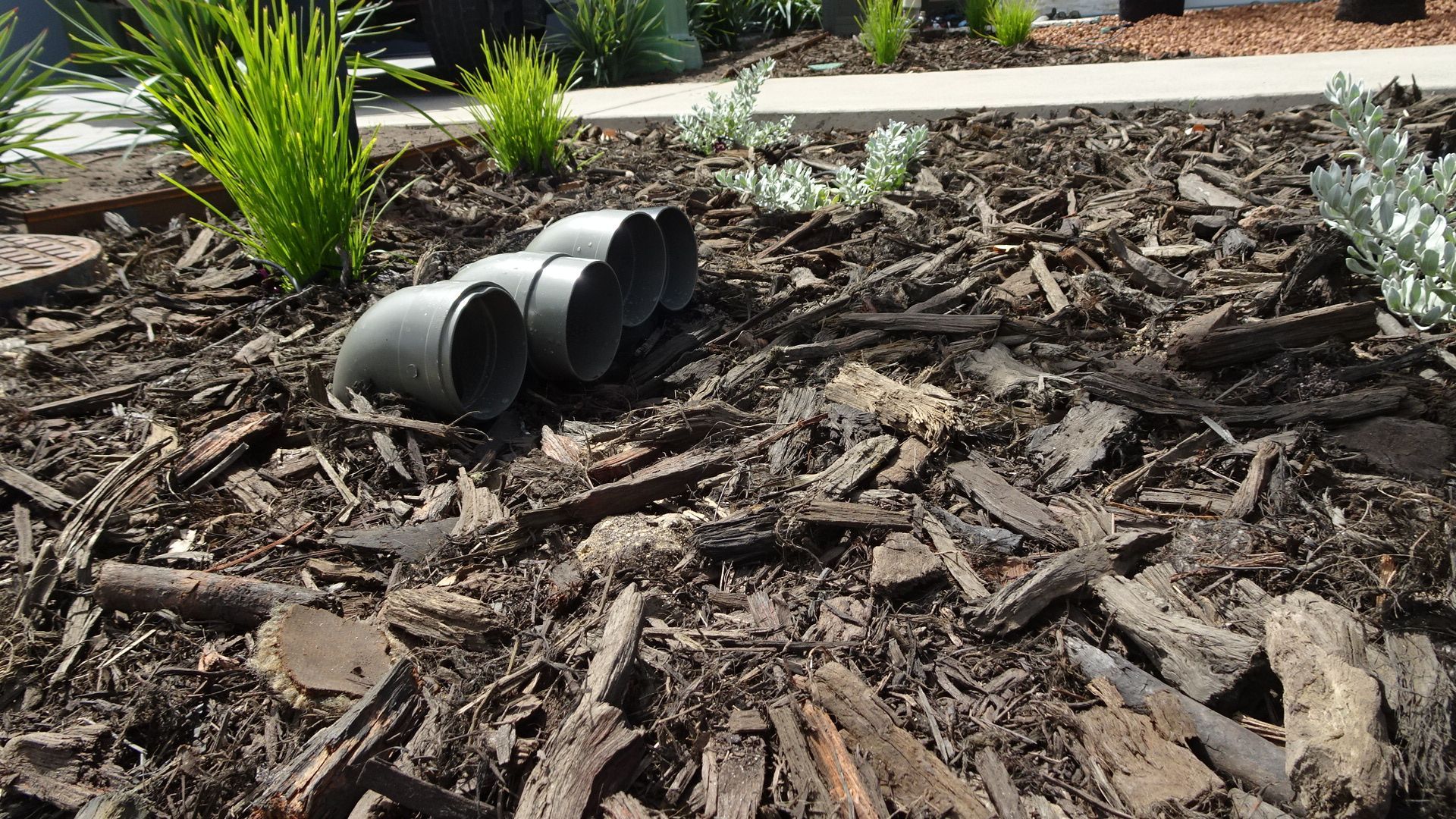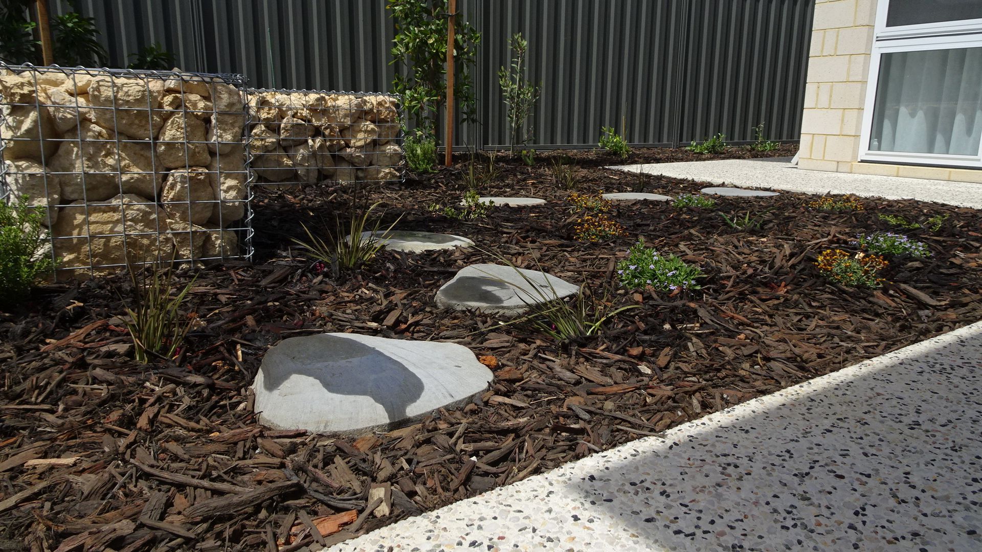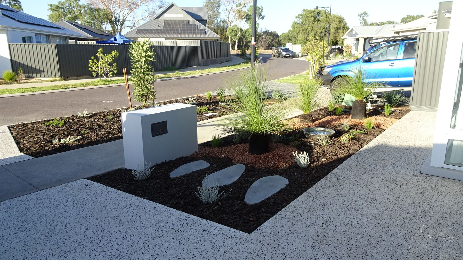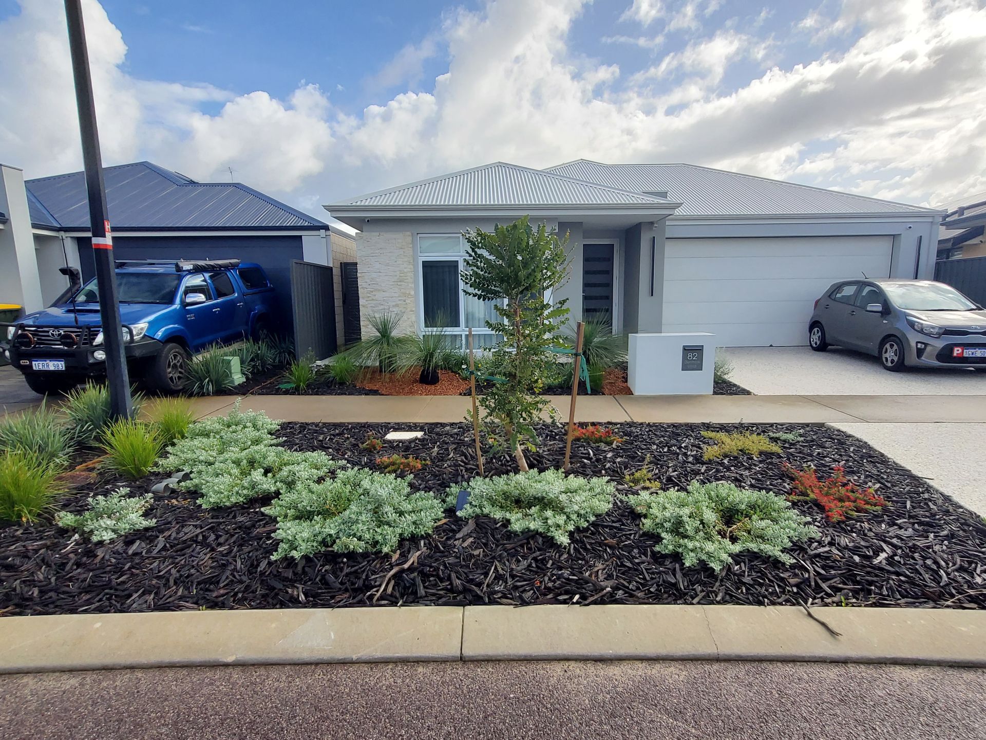 Installed in March, the garden’s three native grass trees have settled beautifully. After a very wet winter, their older outer foliage has begun to droop under the weight of moisture—a natural response as the plant adjusts to its new environment.